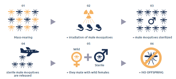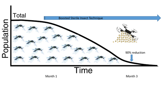 Proprietary method to boost the efficiency of sterile males through coating with larvicides leading to larvae suppression in the field.